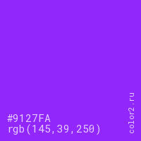 Цвет #9127FA в цветовой модели RGB обозначается тремя октетами (145, 39, 250) в десятичном формате и #9127FA в шестнадцатиричном (hex) формате, которые являются интенсивностью красного 145 (hex 91), интенсивность зелёного 39 (hex 27) и интенсивность синего 250 (hex FA).