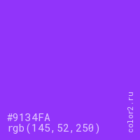Цвет #9134FA в цветовой модели RGB обозначается тремя октетами (145, 52, 250) в десятичном формате и #9134FA в шестнадцатиричном (hex) формате, которые являются интенсивностью красного 145 (hex 91), интенсивность зелёного 52 (hex 34) и интенсивность синего 250 (hex FA).