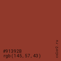 Цвет #91392B в цветовой модели RGB обозначается тремя октетами (145, 57, 43) в десятичном формате и #91392B в шестнадцатиричном (hex) формате, которые являются интенсивностью красного 145 (hex 91), интенсивность зелёного 57 (hex 39) и интенсивность синего 43 (hex 2B).