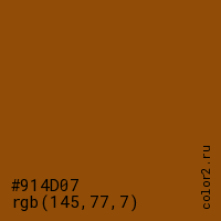 Цвет #914D07 в цветовой модели RGB обозначается тремя октетами (145, 77, 7) в десятичном формате и #914D07 в шестнадцатиричном (hex) формате, которые являются интенсивностью красного 145 (hex 91), интенсивность зелёного 77 (hex 4D) и интенсивность синего 7 (hex 07).