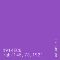 Цвет #914EC0 в цветовой модели RGB обозначается тремя октетами (145, 78, 192) в десятичном формате и #914EC0 в шестнадцатиричном (hex) формате, которые являются интенсивностью красного 145 (hex 91), интенсивность зелёного 78 (hex 4E) и интенсивность синего 192 (hex C0).