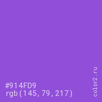 Цвет #914FD9 в цветовой модели RGB обозначается тремя октетами (145, 79, 217) в десятичном формате и #914FD9 в шестнадцатиричном (hex) формате, которые являются интенсивностью красного 145 (hex 91), интенсивность зелёного 79 (hex 4F) и интенсивность синего 217 (hex D9).