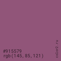 Цвет #915579 в цветовой модели RGB обозначается тремя октетами (145, 85, 121) в десятичном формате и #915579 в шестнадцатиричном (hex) формате, которые являются интенсивностью красного 145 (hex 91), интенсивность зелёного 85 (hex 55) и интенсивность синего 121 (hex 79).