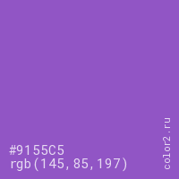 Цвет #9155C5 в цветовой модели RGB обозначается тремя октетами (145, 85, 197) в десятичном формате и #9155C5 в шестнадцатиричном (hex) формате, которые являются интенсивностью красного 145 (hex 91), интенсивность зелёного 85 (hex 55) и интенсивность синего 197 (hex C5).