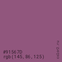 Цвет #91567D в цветовой модели RGB обозначается тремя октетами (145, 86, 125) в десятичном формате и #91567D в шестнадцатиричном (hex) формате, которые являются интенсивностью красного 145 (hex 91), интенсивность зелёного 86 (hex 56) и интенсивность синего 125 (hex 7D).