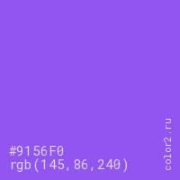 Цвет #9156F0 в цветовой модели RGB обозначается тремя октетами (145, 86, 240) в десятичном формате и #9156F0 в шестнадцатиричном (hex) формате, которые являются интенсивностью красного 145 (hex 91), интенсивность зелёного 86 (hex 56) и интенсивность синего 240 (hex F0).