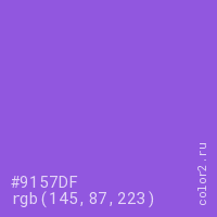 Цвет #9157DF в цветовой модели RGB обозначается тремя октетами (145, 87, 223) в десятичном формате и #9157DF в шестнадцатиричном (hex) формате, которые являются интенсивностью красного 145 (hex 91), интенсивность зелёного 87 (hex 57) и интенсивность синего 223 (hex DF).
