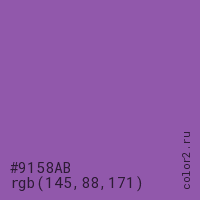 Цвет #9158AB в цветовой модели RGB обозначается тремя октетами (145, 88, 171) в десятичном формате и #9158AB в шестнадцатиричном (hex) формате, которые являются интенсивностью красного 145 (hex 91), интенсивность зелёного 88 (hex 58) и интенсивность синего 171 (hex AB).