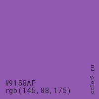 Цвет #9158AF в цветовой модели RGB обозначается тремя октетами (145, 88, 175) в десятичном формате и #9158AF в шестнадцатиричном (hex) формате, которые являются интенсивностью красного 145 (hex 91), интенсивность зелёного 88 (hex 58) и интенсивность синего 175 (hex AF).