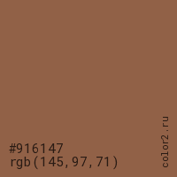 Цвет #916147 в цветовой модели RGB обозначается тремя октетами (145, 97, 71) в десятичном формате и #916147 в шестнадцатиричном (hex) формате, которые являются интенсивностью красного 145 (hex 91), интенсивность зелёного 97 (hex 61) и интенсивность синего 71 (hex 47).