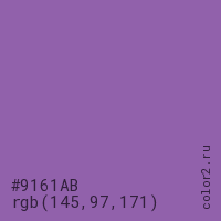 Цвет #9161AB в цветовой модели RGB обозначается тремя октетами (145, 97, 171) в десятичном формате и #9161AB в шестнадцатиричном (hex) формате, которые являются интенсивностью красного 145 (hex 91), интенсивность зелёного 97 (hex 61) и интенсивность синего 171 (hex AB).