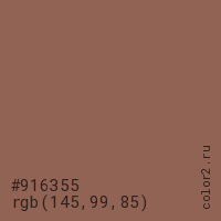 Цвет #916355 в цветовой модели RGB обозначается тремя октетами (145, 99, 85) в десятичном формате и #916355 в шестнадцатиричном (hex) формате, которые являются интенсивностью красного 145 (hex 91), интенсивность зелёного 99 (hex 63) и интенсивность синего 85 (hex 55).