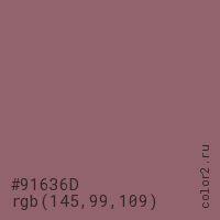 Цвет #91636D в цветовой модели RGB обозначается тремя октетами (145, 99, 109) в десятичном формате и #91636D в шестнадцатиричном (hex) формате, которые являются интенсивностью красного 145 (hex 91), интенсивность зелёного 99 (hex 63) и интенсивность синего 109 (hex 6D).