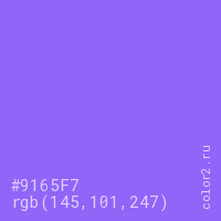 Цвет #9165F7 в цветовой модели RGB обозначается тремя октетами (145, 101, 247) в десятичном формате и #9165F7 в шестнадцатиричном (hex) формате, которые являются интенсивностью красного 145 (hex 91), интенсивность зелёного 101 (hex 65) и интенсивность синего 247 (hex F7).