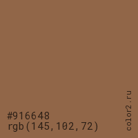 Цвет #916648 в цветовой модели RGB обозначается тремя октетами (145, 102, 72) в десятичном формате и #916648 в шестнадцатиричном (hex) формате, которые являются интенсивностью красного 145 (hex 91), интенсивность зелёного 102 (hex 66) и интенсивность синего 72 (hex 48).