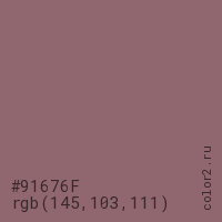 Цвет #91676F в цветовой модели RGB обозначается тремя октетами (145, 103, 111) в десятичном формате и #91676F в шестнадцатиричном (hex) формате, которые являются интенсивностью красного 145 (hex 91), интенсивность зелёного 103 (hex 67) и интенсивность синего 111 (hex 6F).