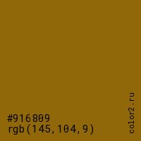 Цвет #916809 в цветовой модели RGB обозначается тремя октетами (145, 104, 9) в десятичном формате и #916809 в шестнадцатиричном (hex) формате, которые являются интенсивностью красного 145 (hex 91), интенсивность зелёного 104 (hex 68) и интенсивность синего 9 (hex 09).