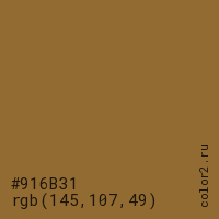 Цвет #916B31 в цветовой модели RGB обозначается тремя октетами (145, 107, 49) в десятичном формате и #916B31 в шестнадцатиричном (hex) формате, которые являются интенсивностью красного 145 (hex 91), интенсивность зелёного 107 (hex 6B) и интенсивность синего 49 (hex 31).