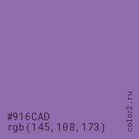 Цвет #916CAD в цветовой модели RGB обозначается тремя октетами (145, 108, 173) в десятичном формате и #916CAD в шестнадцатиричном (hex) формате, которые являются интенсивностью красного 145 (hex 91), интенсивность зелёного 108 (hex 6C) и интенсивность синего 173 (hex AD).