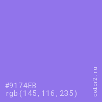 Цвет #9174EB в цветовой модели RGB обозначается тремя октетами (145, 116, 235) в десятичном формате и #9174EB в шестнадцатиричном (hex) формате, которые являются интенсивностью красного 145 (hex 91), интенсивность зелёного 116 (hex 74) и интенсивность синего 235 (hex EB).