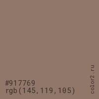 Цвет #917769 в цветовой модели RGB обозначается тремя октетами (145, 119, 105) в десятичном формате и #917769 в шестнадцатиричном (hex) формате, которые являются интенсивностью красного 145 (hex 91), интенсивность зелёного 119 (hex 77) и интенсивность синего 105 (hex 69).