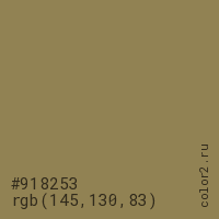 Цвет #918253 в цветовой модели RGB обозначается тремя октетами (145, 130, 83) в десятичном формате и #918253 в шестнадцатиричном (hex) формате, которые являются интенсивностью красного 145 (hex 91), интенсивность зелёного 130 (hex 82) и интенсивность синего 83 (hex 53).