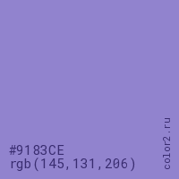 Цвет #9183CE в цветовой модели RGB обозначается тремя октетами (145, 131, 206) в десятичном формате и #9183CE в шестнадцатиричном (hex) формате, которые являются интенсивностью красного 145 (hex 91), интенсивность зелёного 131 (hex 83) и интенсивность синего 206 (hex CE).