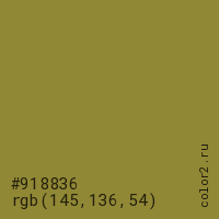 Цвет #918836 в цветовой модели RGB обозначается тремя октетами (145, 136, 54) в десятичном формате и #918836 в шестнадцатиричном (hex) формате, которые являются интенсивностью красного 145 (hex 91), интенсивность зелёного 136 (hex 88) и интенсивность синего 54 (hex 36).