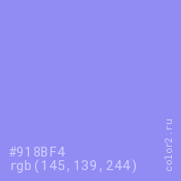 Цвет #918BF4 в цветовой модели RGB обозначается тремя октетами (145, 139, 244) в десятичном формате и #918BF4 в шестнадцатиричном (hex) формате, которые являются интенсивностью красного 145 (hex 91), интенсивность зелёного 139 (hex 8B) и интенсивность синего 244 (hex F4).