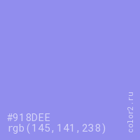 Цвет #918DEE в цветовой модели RGB обозначается тремя октетами (145, 141, 238) в десятичном формате и #918DEE в шестнадцатиричном (hex) формате, которые являются интенсивностью красного 145 (hex 91), интенсивность зелёного 141 (hex 8D) и интенсивность синего 238 (hex EE).