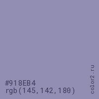 Цвет #918EB4 в цветовой модели RGB обозначается тремя октетами (145, 142, 180) в десятичном формате и #918EB4 в шестнадцатиричном (hex) формате, которые являются интенсивностью красного 145 (hex 91), интенсивность зелёного 142 (hex 8E) и интенсивность синего 180 (hex B4).