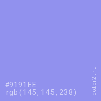 Цвет #9191EE в цветовой модели RGB обозначается тремя октетами (145, 145, 238) в десятичном формате и #9191EE в шестнадцатиричном (hex) формате, которые являются интенсивностью красного 145 (hex 91), интенсивность зелёного 145 (hex 91) и интенсивность синего 238 (hex EE).