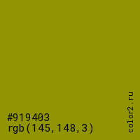 Цвет #919403 в цветовой модели RGB обозначается тремя октетами (145, 148, 3) в десятичном формате и #919403 в шестнадцатиричном (hex) формате, которые являются интенсивностью красного 145 (hex 91), интенсивность зелёного 148 (hex 94) и интенсивность синего 3 (hex 03).