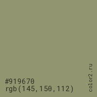 Цвет #919670 в цветовой модели RGB обозначается тремя октетами (145, 150, 112) в десятичном формате и #919670 в шестнадцатиричном (hex) формате, которые являются интенсивностью красного 145 (hex 91), интенсивность зелёного 150 (hex 96) и интенсивность синего 112 (hex 70).