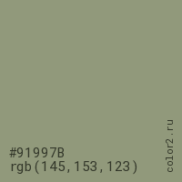 Цвет #91997B в цветовой модели RGB обозначается тремя октетами (145, 153, 123) в десятичном формате и #91997B в шестнадцатиричном (hex) формате, которые являются интенсивностью красного 145 (hex 91), интенсивность зелёного 153 (hex 99) и интенсивность синего 123 (hex 7B).