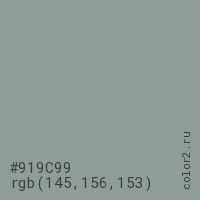 Цвет #919C99 в цветовой модели RGB обозначается тремя октетами (145, 156, 153) в десятичном формате и #919C99 в шестнадцатиричном (hex) формате, которые являются интенсивностью красного 145 (hex 91), интенсивность зелёного 156 (hex 9C) и интенсивность синего 153 (hex 99).