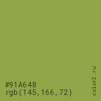 Цвет #91A648 в цветовой модели RGB обозначается тремя октетами (145, 166, 72) в десятичном формате и #91A648 в шестнадцатиричном (hex) формате, которые являются интенсивностью красного 145 (hex 91), интенсивность зелёного 166 (hex A6) и интенсивность синего 72 (hex 48).