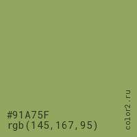 Цвет #91A75F в цветовой модели RGB обозначается тремя октетами (145, 167, 95) в десятичном формате и #91A75F в шестнадцатиричном (hex) формате, которые являются интенсивностью красного 145 (hex 91), интенсивность зелёного 167 (hex A7) и интенсивность синего 95 (hex 5F).