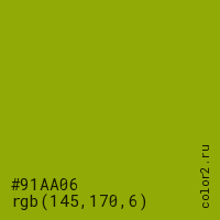Цвет #91AA06 в цветовой модели RGB обозначается тремя октетами (145, 170, 6) в десятичном формате и #91AA06 в шестнадцатиричном (hex) формате, которые являются интенсивностью красного 145 (hex 91), интенсивность зелёного 170 (hex AA) и интенсивность синего 6 (hex 06).