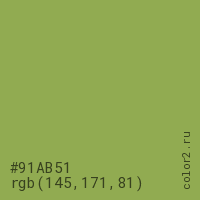 Цвет #91AB51 в цветовой модели RGB обозначается тремя октетами (145, 171, 81) в десятичном формате и #91AB51 в шестнадцатиричном (hex) формате, которые являются интенсивностью красного 145 (hex 91), интенсивность зелёного 171 (hex AB) и интенсивность синего 81 (hex 51).