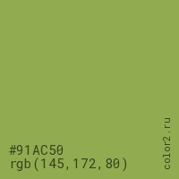 Цвет #91AC50 в цветовой модели RGB обозначается тремя октетами (145, 172, 80) в десятичном формате и #91AC50 в шестнадцатиричном (hex) формате, которые являются интенсивностью красного 145 (hex 91), интенсивность зелёного 172 (hex AC) и интенсивность синего 80 (hex 50).