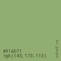 Цвет #91AD71 в цветовой модели RGB обозначается тремя октетами (145, 173, 113) в десятичном формате и #91AD71 в шестнадцатиричном (hex) формате, которые являются интенсивностью красного 145 (hex 91), интенсивность зелёного 173 (hex AD) и интенсивность синего 113 (hex 71).