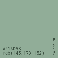 Цвет #91AD98 в цветовой модели RGB обозначается тремя октетами (145, 173, 152) в десятичном формате и #91AD98 в шестнадцатиричном (hex) формате, которые являются интенсивностью красного 145 (hex 91), интенсивность зелёного 173 (hex AD) и интенсивность синего 152 (hex 98).