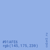 Цвет #91AFE6 в цветовой модели RGB обозначается тремя октетами (145, 175, 230) в десятичном формате и #91AFE6 в шестнадцатиричном (hex) формате, которые являются интенсивностью красного 145 (hex 91), интенсивность зелёного 175 (hex AF) и интенсивность синего 230 (hex E6).