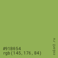 Цвет #91B054 в цветовой модели RGB обозначается тремя октетами (145, 176, 84) в десятичном формате и #91B054 в шестнадцатиричном (hex) формате, которые являются интенсивностью красного 145 (hex 91), интенсивность зелёного 176 (hex B0) и интенсивность синего 84 (hex 54).