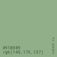 Цвет #91B089 в цветовой модели RGB обозначается тремя октетами (145, 176, 137) в десятичном формате и #91B089 в шестнадцатиричном (hex) формате, которые являются интенсивностью красного 145 (hex 91), интенсивность зелёного 176 (hex B0) и интенсивность синего 137 (hex 89).