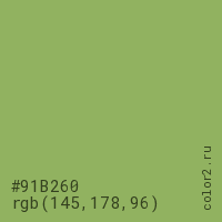 Цвет #91B260 в цветовой модели RGB обозначается тремя октетами (145, 178, 96) в десятичном формате и #91B260 в шестнадцатиричном (hex) формате, которые являются интенсивностью красного 145 (hex 91), интенсивность зелёного 178 (hex B2) и интенсивность синего 96 (hex 60).