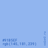 Цвет #91B5EF в цветовой модели RGB обозначается тремя октетами (145, 181, 239) в десятичном формате и #91B5EF в шестнадцатиричном (hex) формате, которые являются интенсивностью красного 145 (hex 91), интенсивность зелёного 181 (hex B5) и интенсивность синего 239 (hex EF).