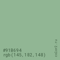 Цвет #91B694 в цветовой модели RGB обозначается тремя октетами (145, 182, 148) в десятичном формате и #91B694 в шестнадцатиричном (hex) формате, которые являются интенсивностью красного 145 (hex 91), интенсивность зелёного 182 (hex B6) и интенсивность синего 148 (hex 94).