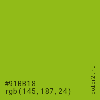 Цвет #91BB18 в цветовой модели RGB обозначается тремя октетами (145, 187, 24) в десятичном формате и #91BB18 в шестнадцатиричном (hex) формате, которые являются интенсивностью красного 145 (hex 91), интенсивность зелёного 187 (hex BB) и интенсивность синего 24 (hex 18).